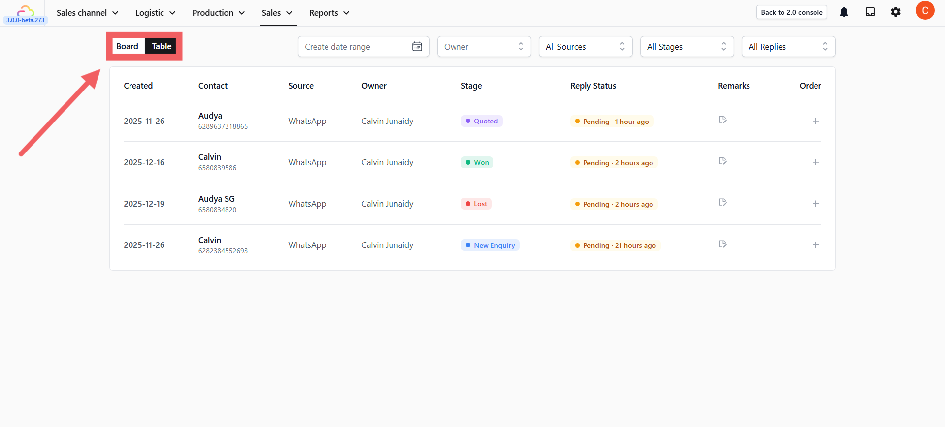 - A customer messages you on WhatsApp → A deal is automatically created under New Enquiry.