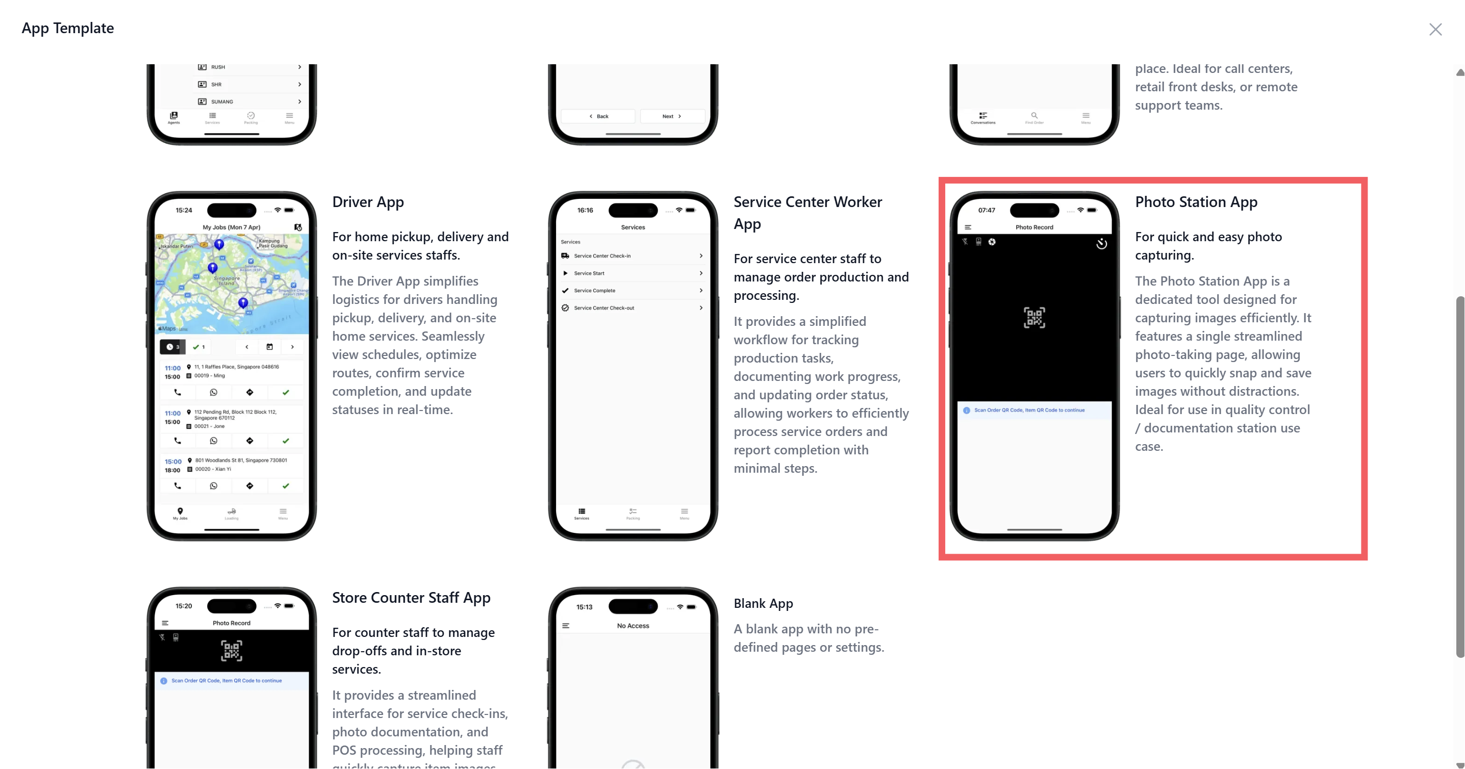 - Menu (0): This allows you to add a Header Menu. You can link buttons at the top right of the camera screen to other helpful pages, like "Order Details," so workers can check instructions without leaving the camera.