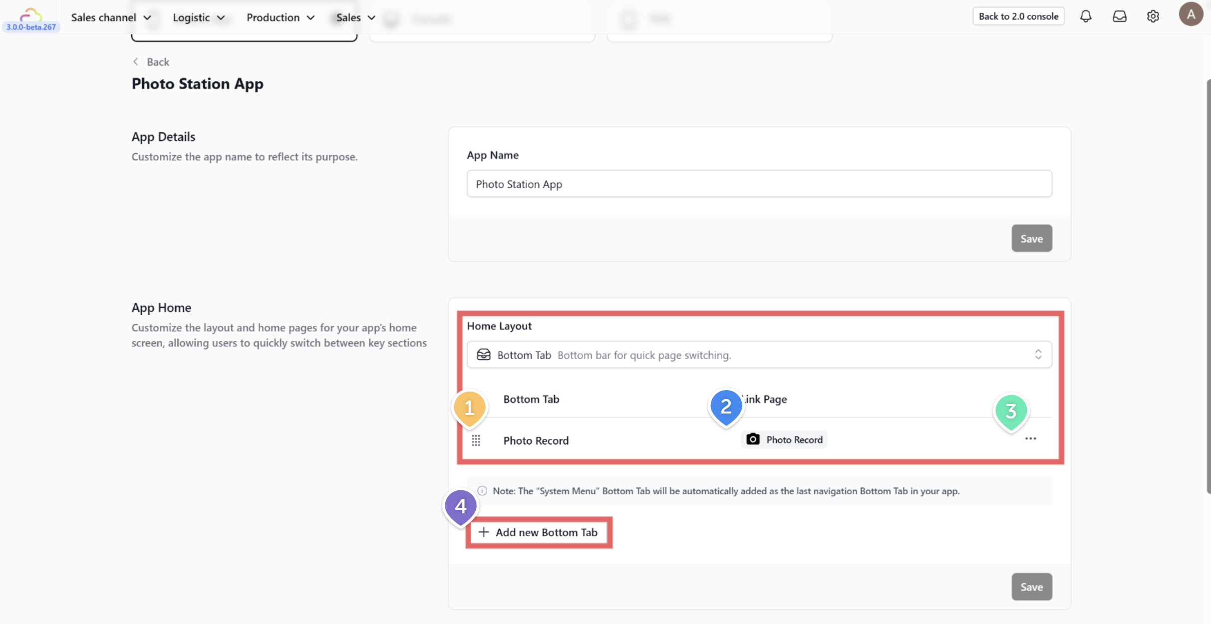 - Drawer Menu / Bottom Tab Column: This area lists your active menu items. You can click and drag the "six-dot" icon to rearrange them in the order of importance.