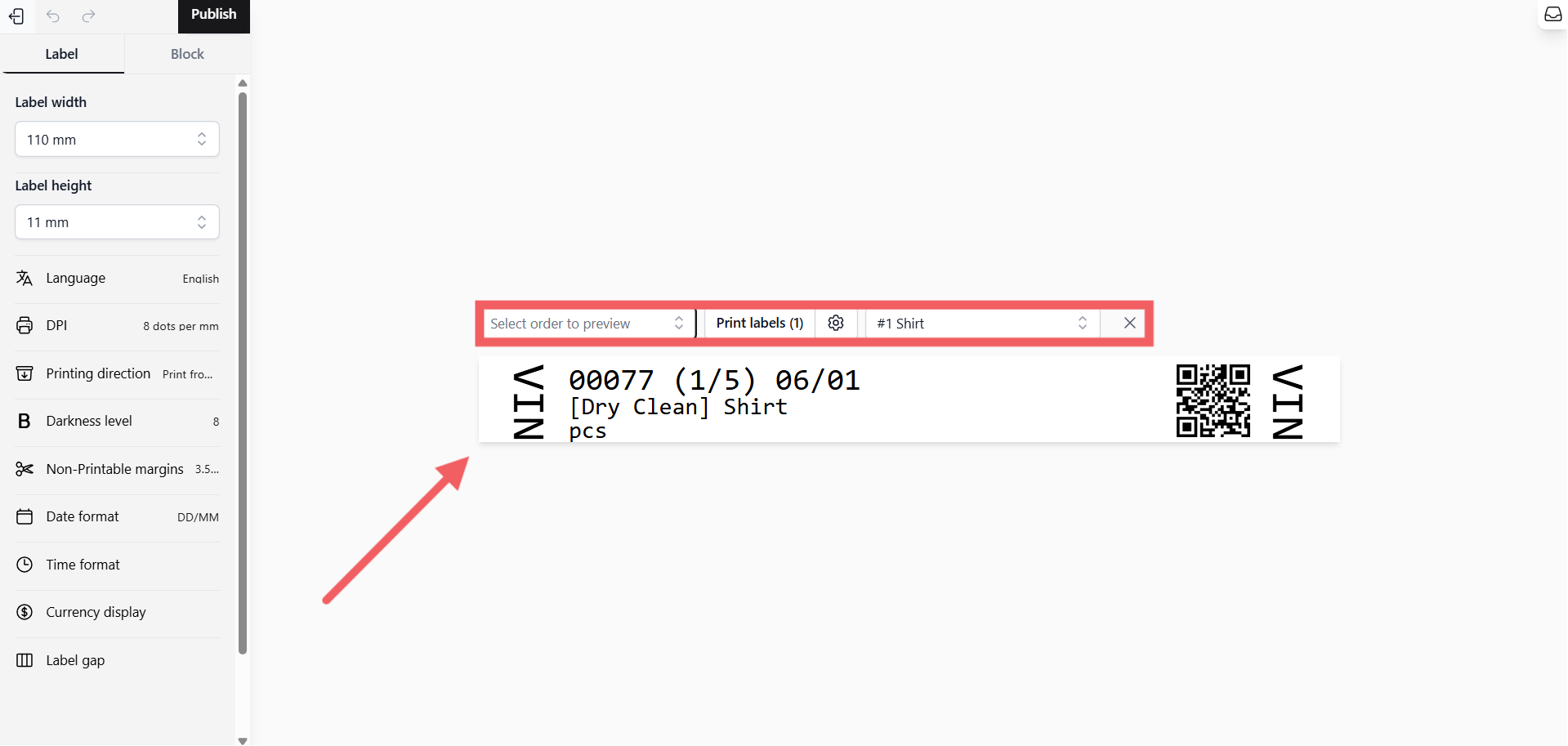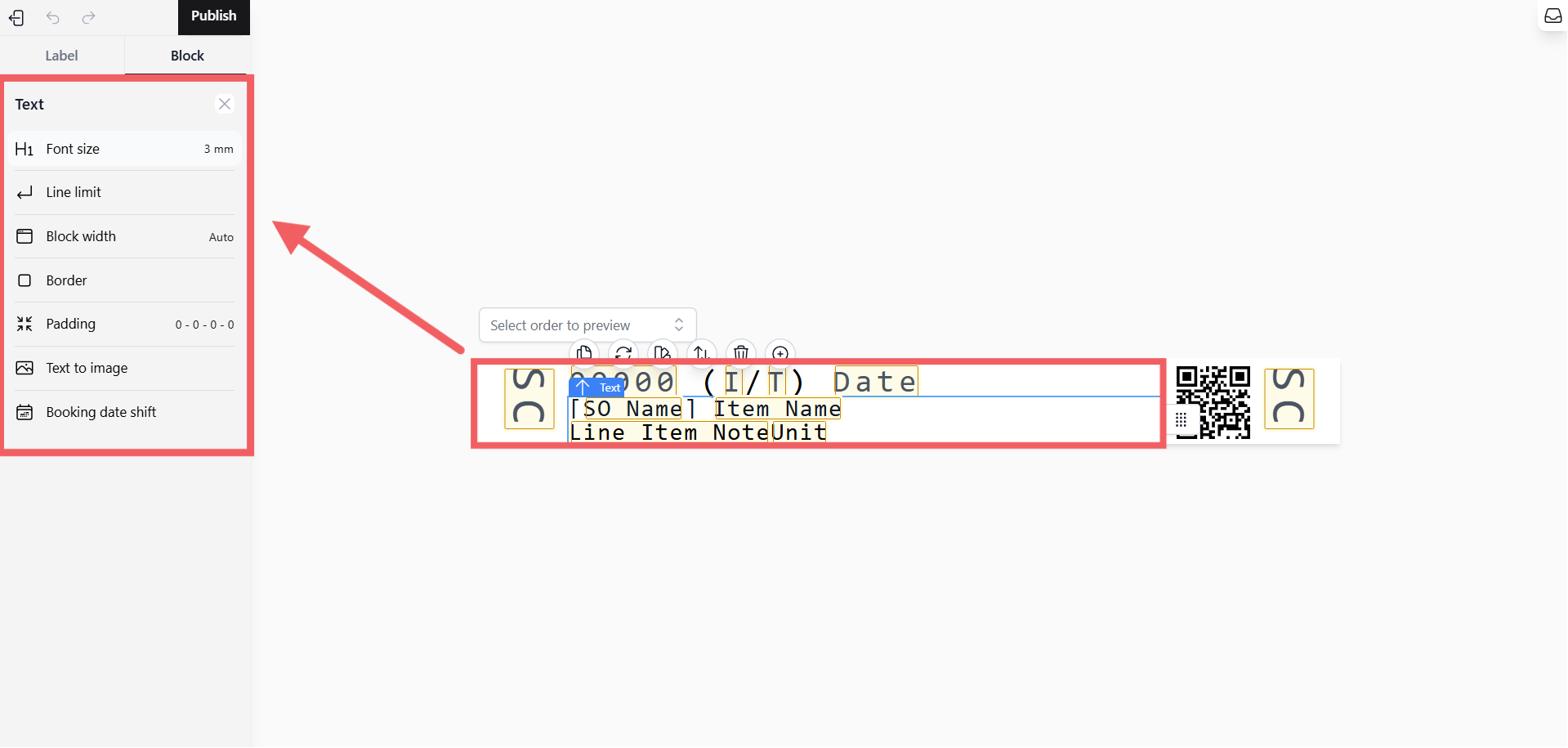 Use the preview bar at the top to select a real Order and Line Item (e.g., #1 Shirt). This allows you to test how dynamic data looks before publishing.