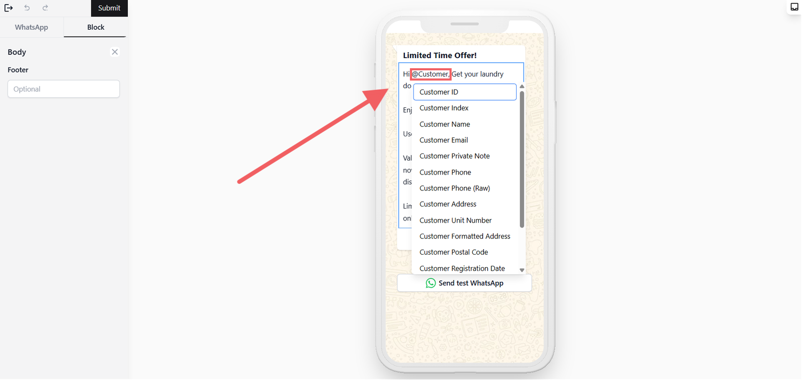 Once you click Create, you'll enter the template editor. On the left you'll see two tabs: WhatsApp and Block.