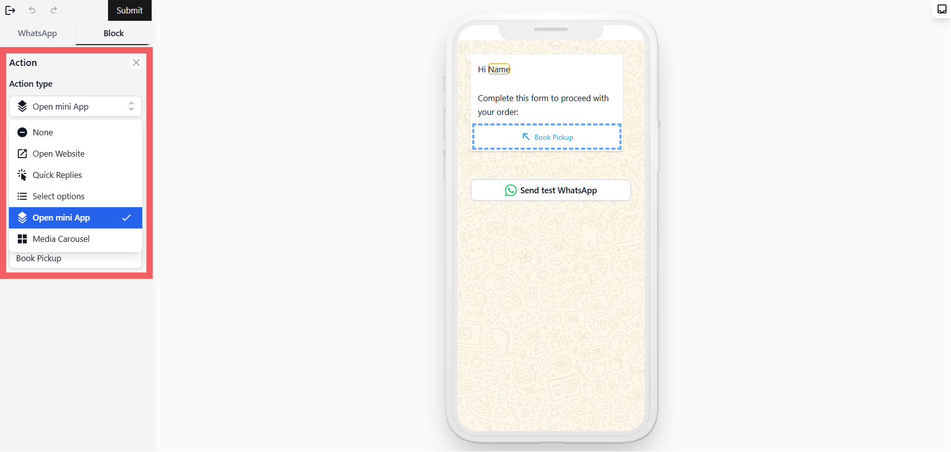 • Open Mini App — Opens a booking or order form inside WhatsApp — configure your Mini App here