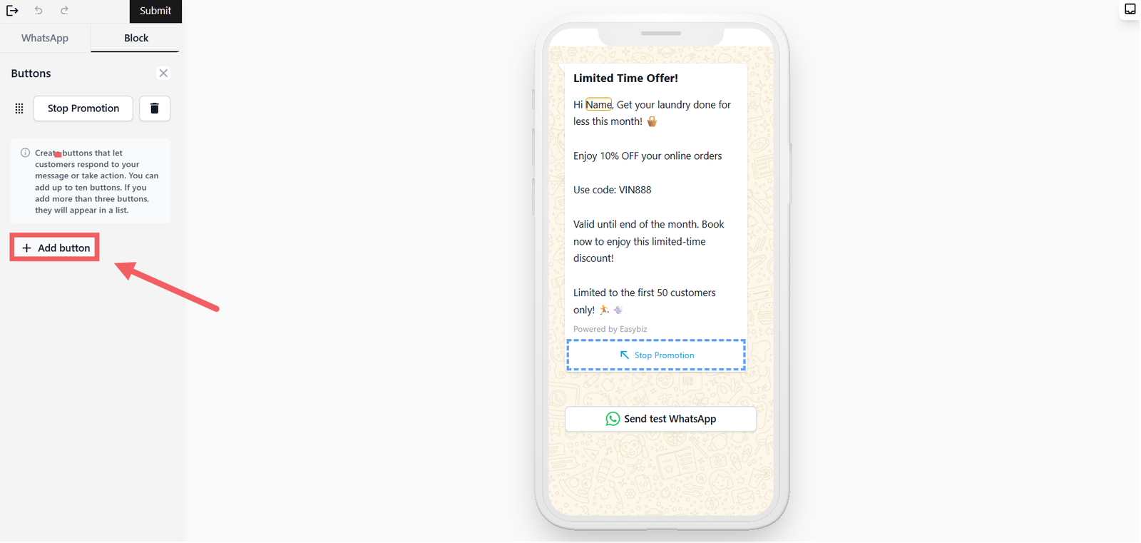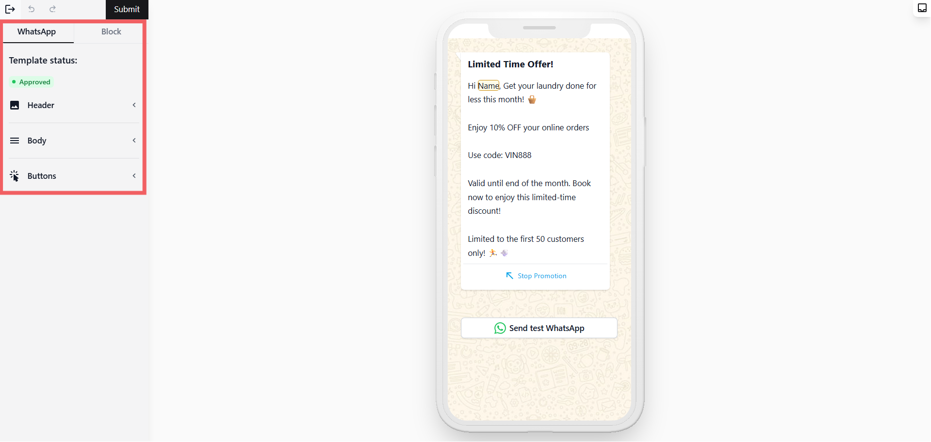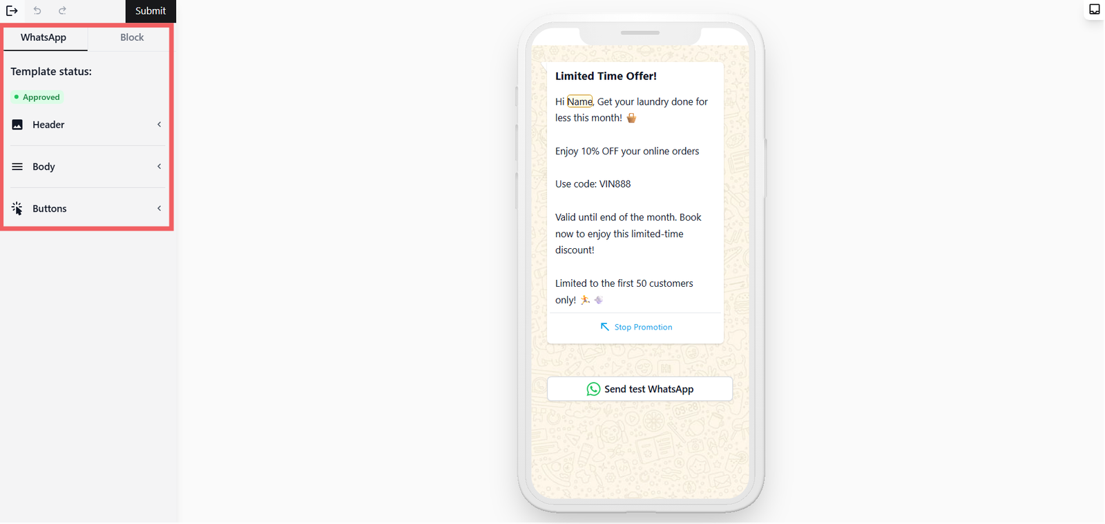 When you're happy with the template, click Submit at the top of the page. WhatsApp will review it — approval usually takes a few minutes but can take up to 24 hours.