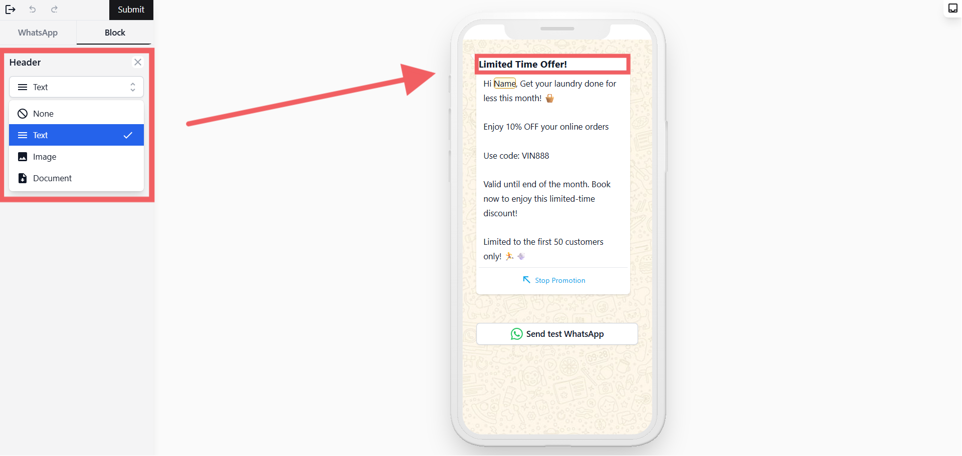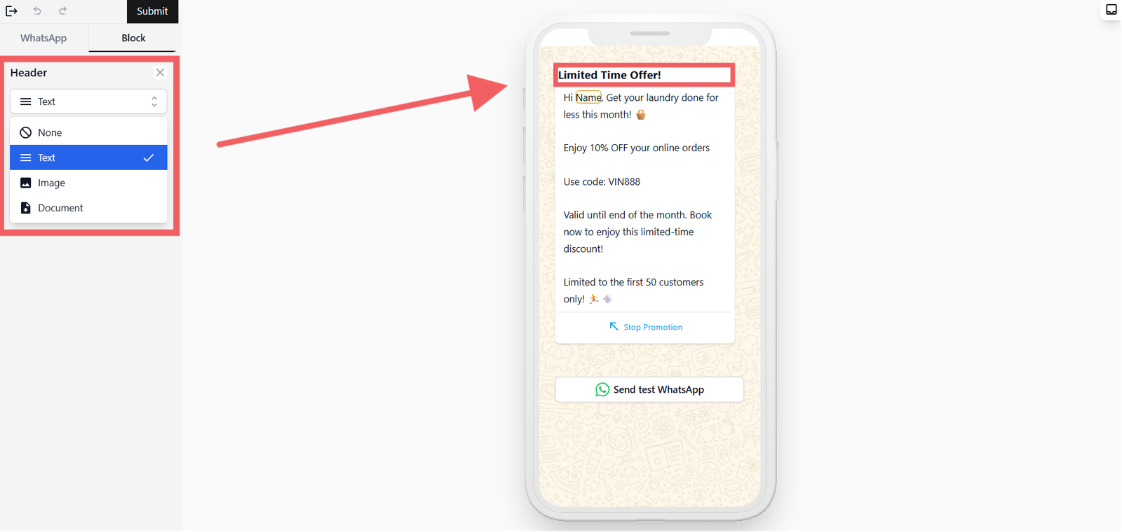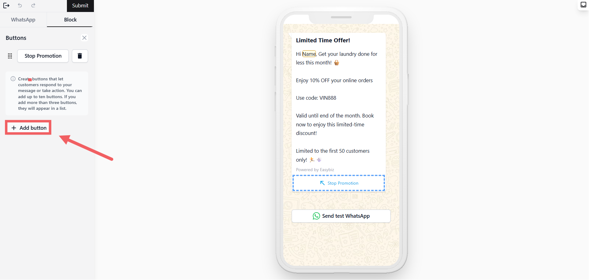 When you're happy with the template, click Submit at the top of the page. WhatsApp will review it — approval usually takes a few minutes but can take up to 24 hours.