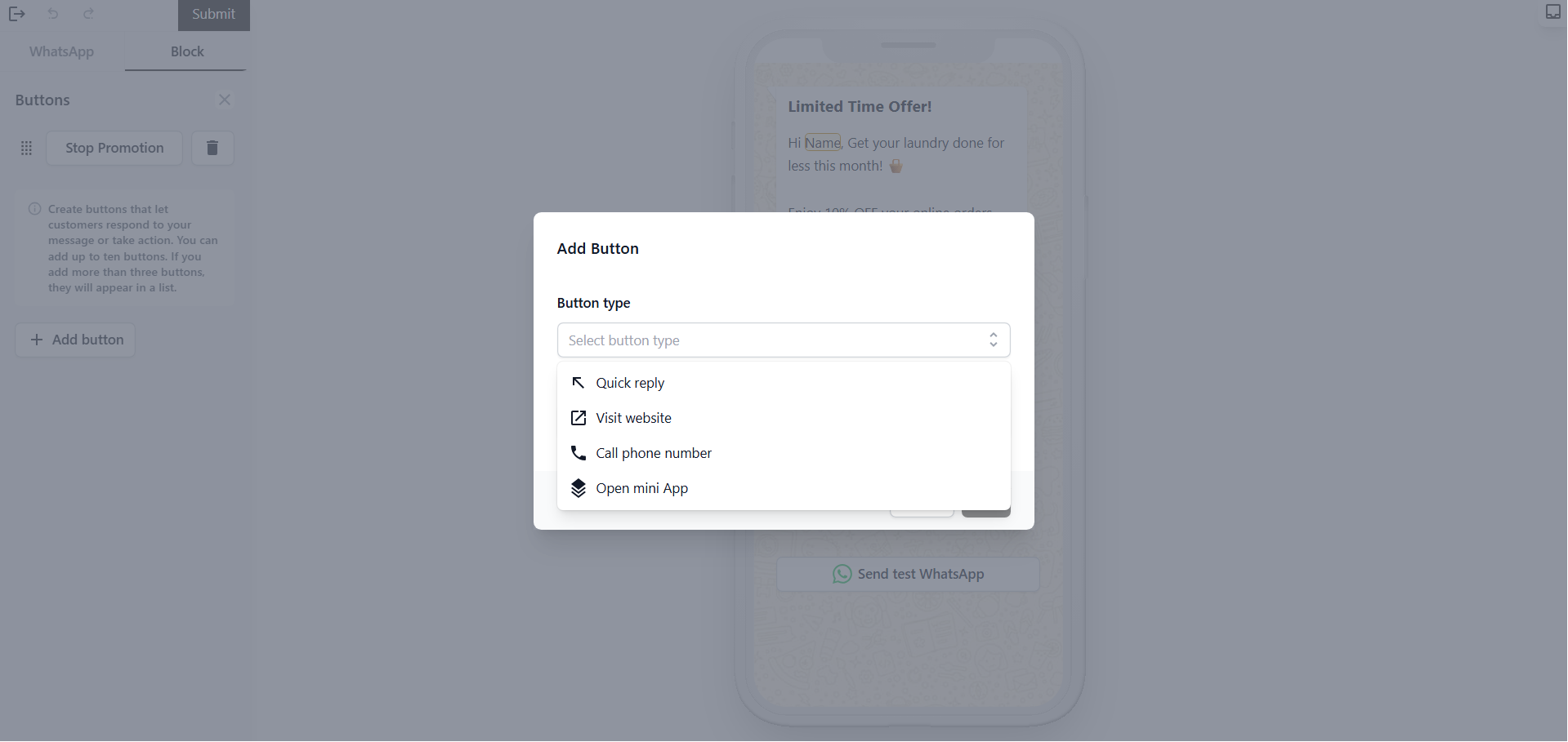 Buttons let customers take action directly from the message without having to type a reply. You can add up to 10 buttons. If you add more than 3, they'll appear as a list.