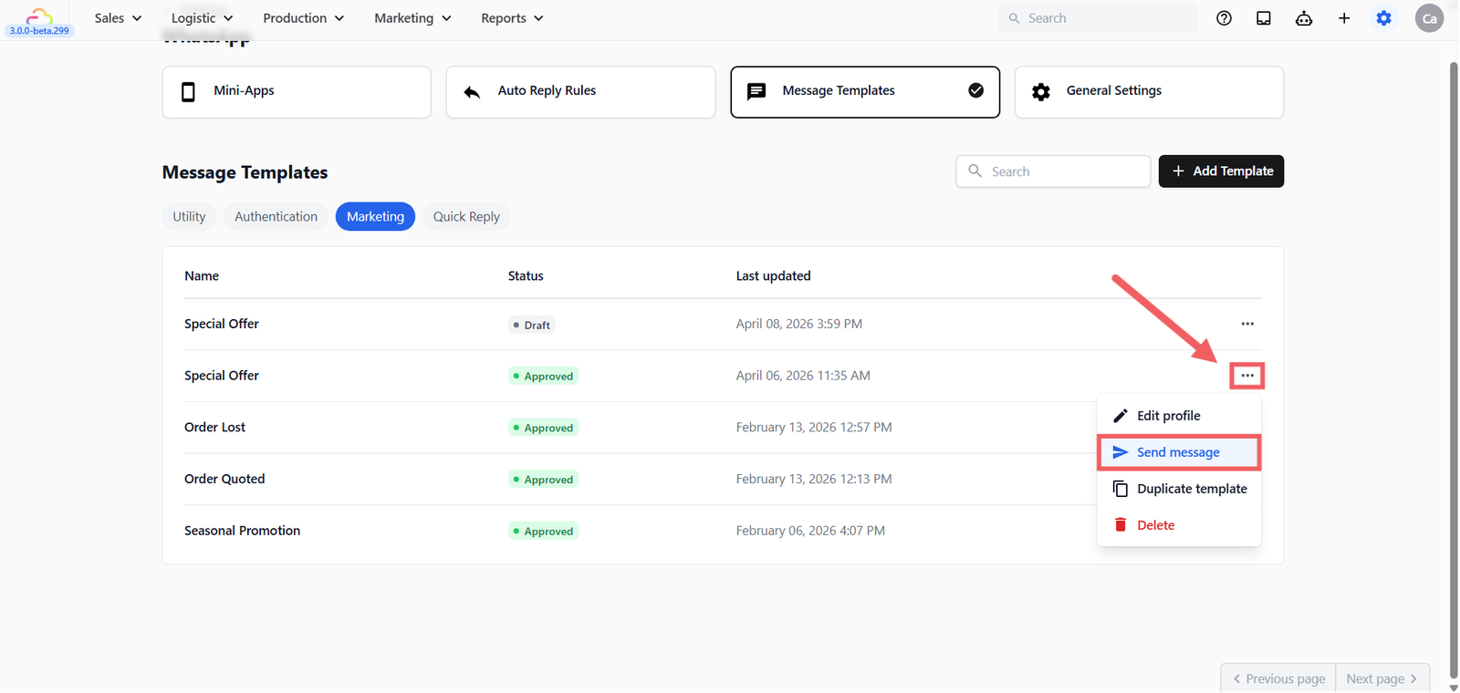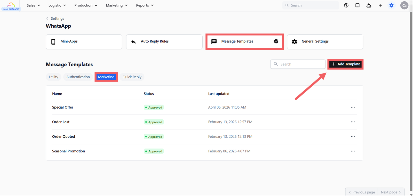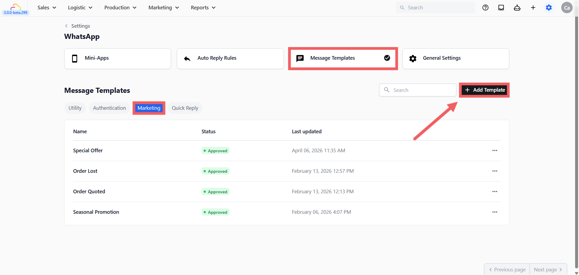 After submitting, you can return to the template list where the status will show as Pending. Once Meta approves it, the status will change to Approved and the template is ready to send to customers.