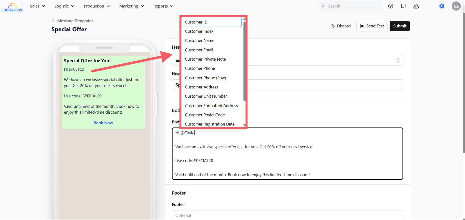 - Special Offer -> Announce a discount or limited-time deal. Pre-written with a promotional message, coupon code, and a Book Now button.