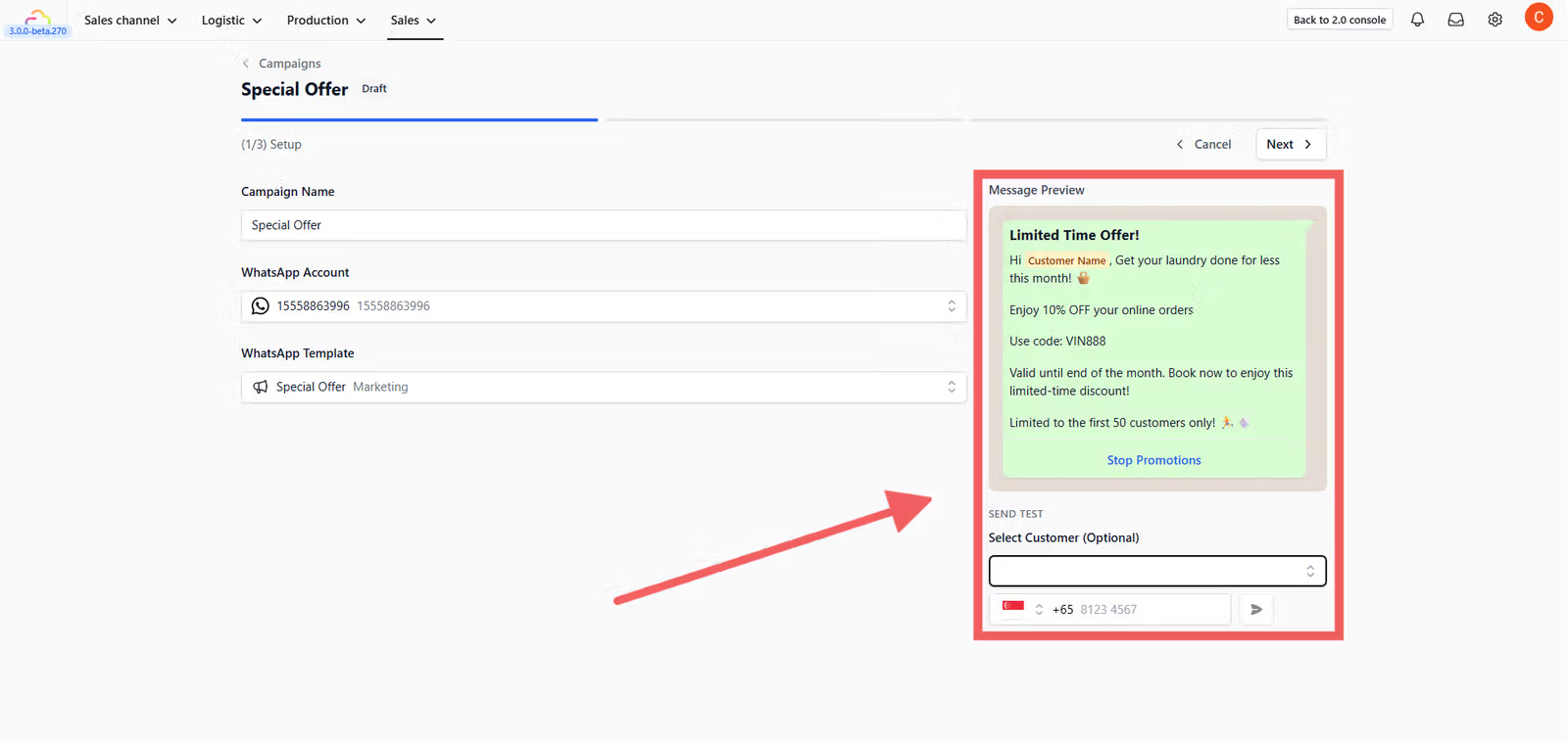 You can also send a Marketing template to one specific customer in two ways: