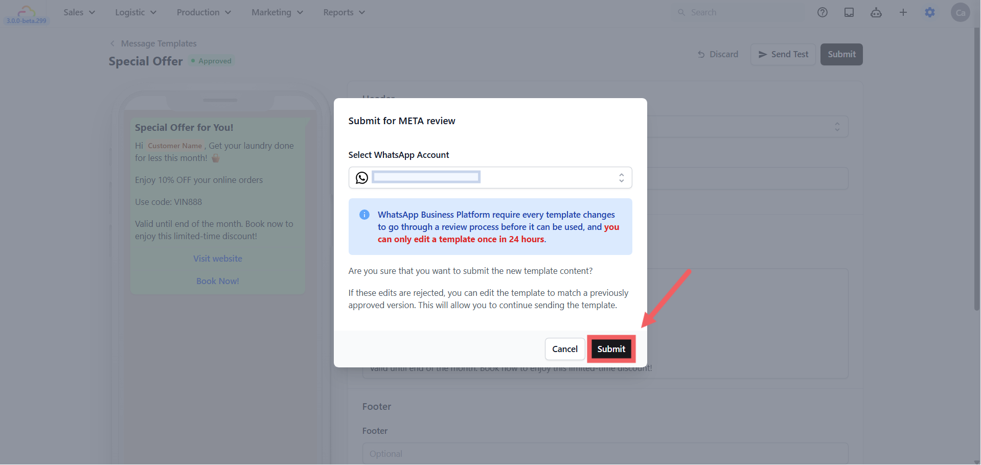 - Submit -> submit your template to Meta for review