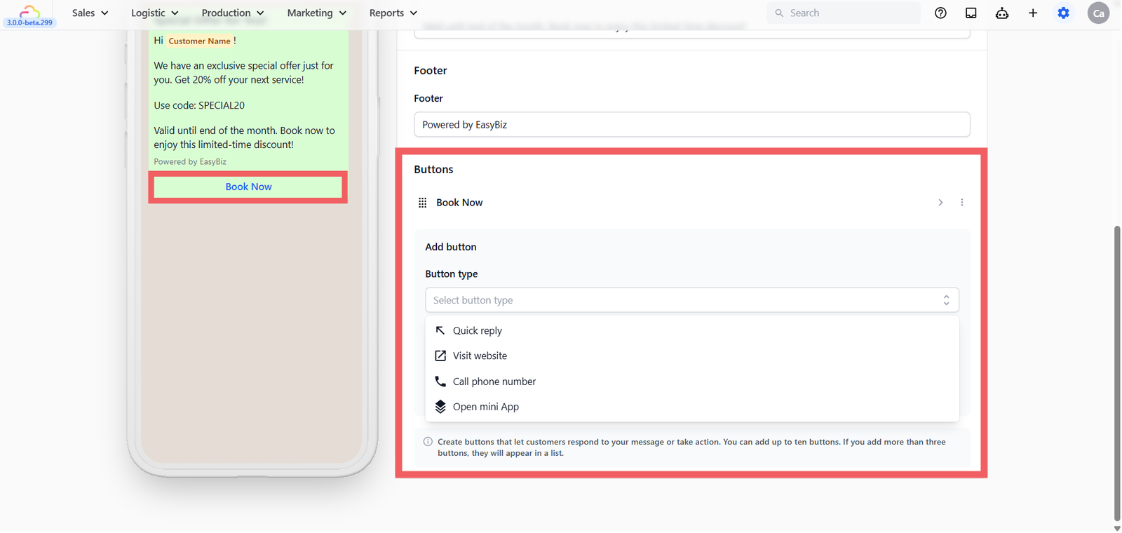 - Quick reply -> A tappable reply button the customer can tap (e.g. "Yes, I'm interested", "Stop Promotion").